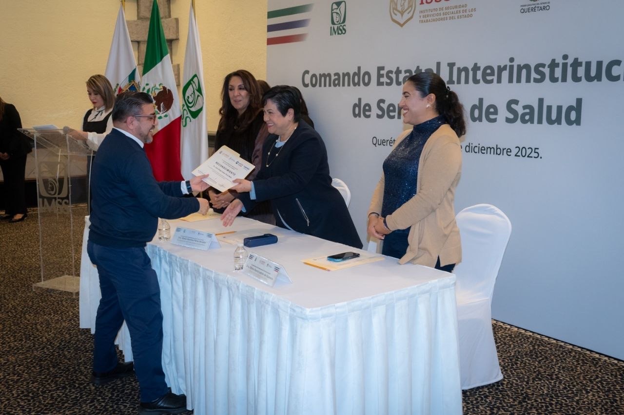 La secretaria de Salud del estado de Querétaro, María Martina Pérez Rendón, encabezó la ceremonia de entrega de reconocimientos al personal del Instituto Mexicano del Seguro Social (IMSS), del Instituto de Seguridad y Servicios Sociales de los Trabajadores del Estado (ISSSTE) y de Servicios de Salud del Estado de Querétaro (SESEQ) que integran el Comando Estatal Interinstitucional del Sector Salud, cuyo objetivo es fortalecer la seguridad y el bienestar de la población queretana.