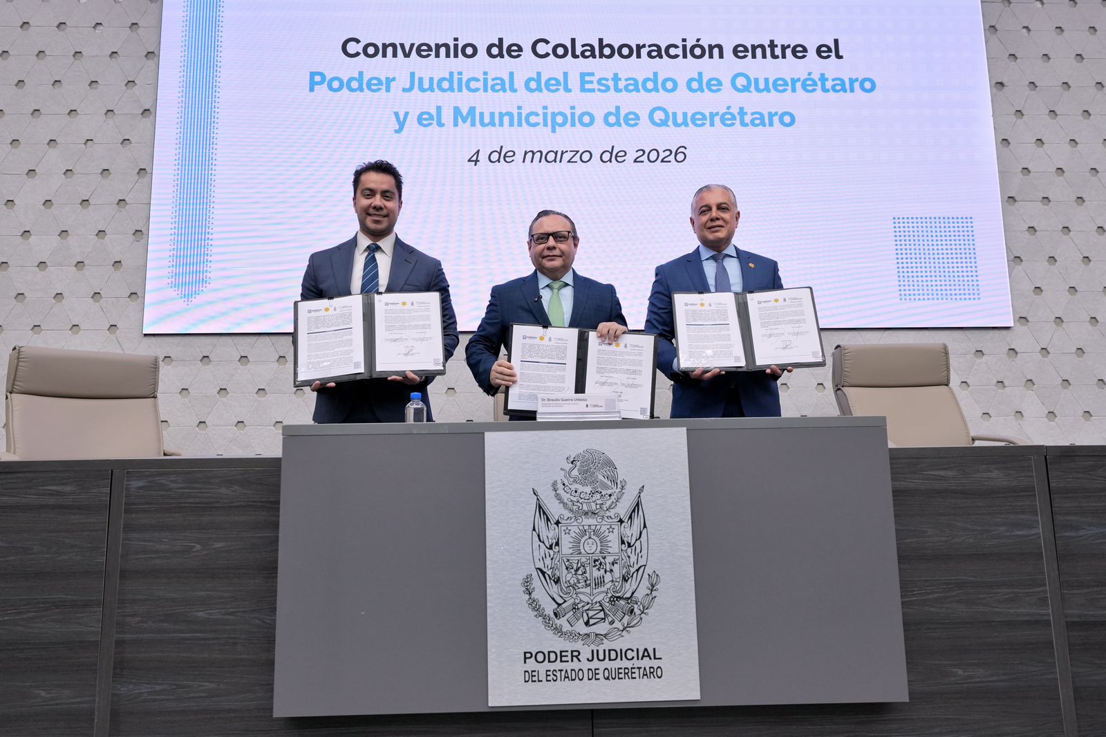 El presidente municipal de Querétaro firmó un convenio de colaboración con el Poder Judicial del Estado de Querétaro, que encabeza el magistrado presidente, Braulio Mario Guerra Urbiola, para fortalecer la coordinación institucional y procurar la ejecución inmediata de medidas de protección urgentes a favor de personas en situación de riesgo, mediante el uso de herramientas tecnológicas que optimizan la comunicación y reducen tiempos de respuesta.