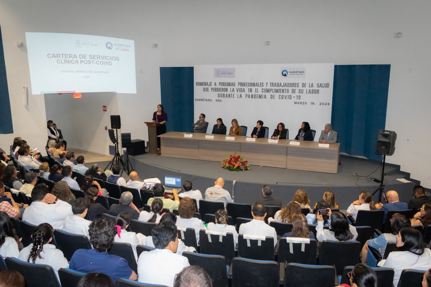 En el evento, el subcoordinador General Médico de Servicios de Salud del Estado de Querétaro (SESEQ), Francisco José Rivera Pesquera, dio la bienvenida a las y los asistentes. El Director de Servicios Médicos Hospitalarios, Hugo Daniel Cerrillo Cruz, presentó una reseña de la pandemia en el estado, destacando las acciones emprendidas por el personal de salud en los distintos sectores y niveles de atención para atender a la población.